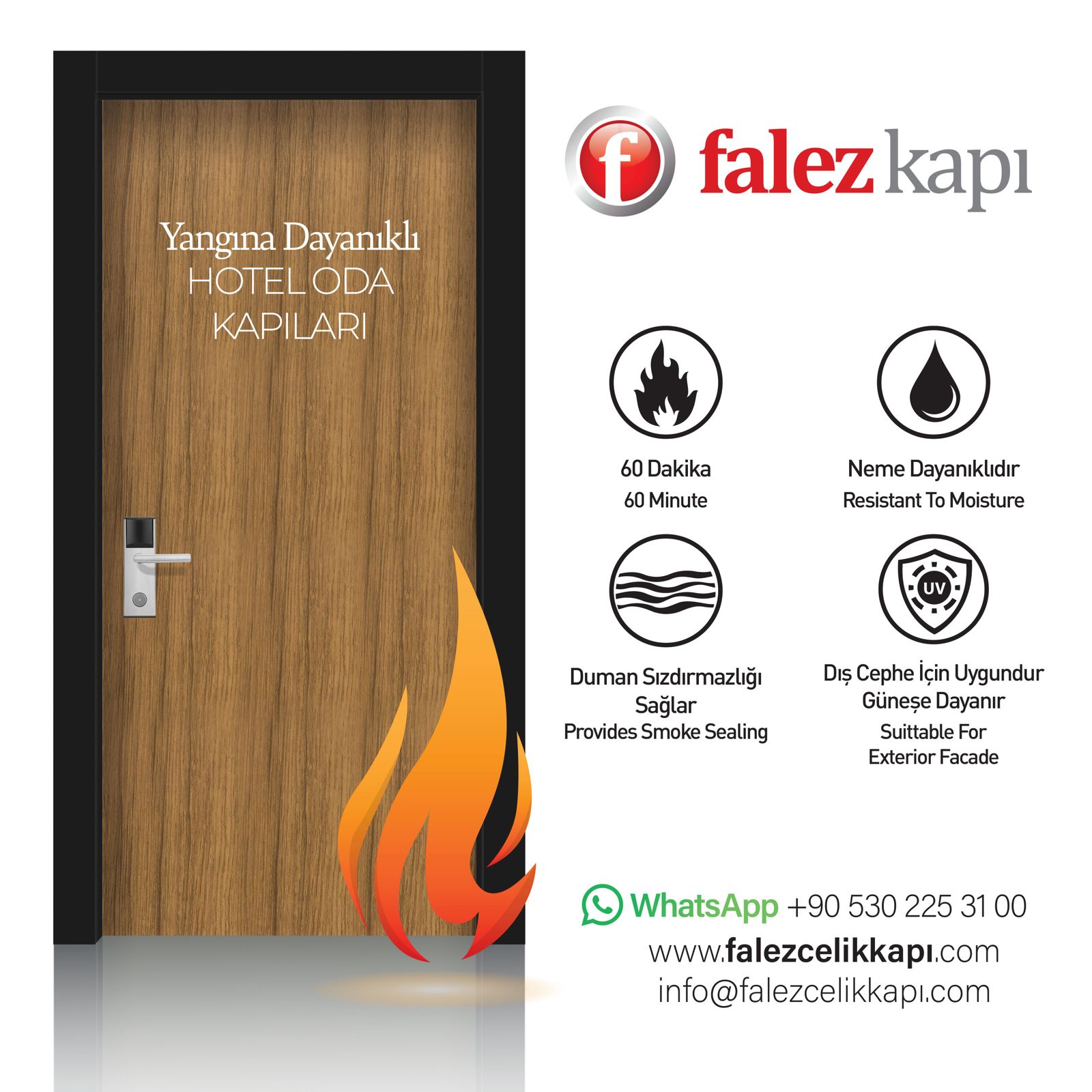 Yangından kapısı çeşitlerimiz , olağanüstü dayanıklılıkları ve işlevsellikleri bununla beraber sertifikalandırılmış standartları ile kalite ve güvence konusunda sizi ikna edecektir. Falez Çelik Kapı, yıllardır endüstrinin bir çok koluna ve çok çeşitli gereksinimlere hitap eden yangın kapıları imal etmektedir.